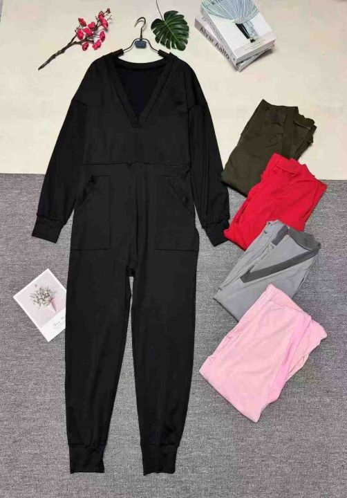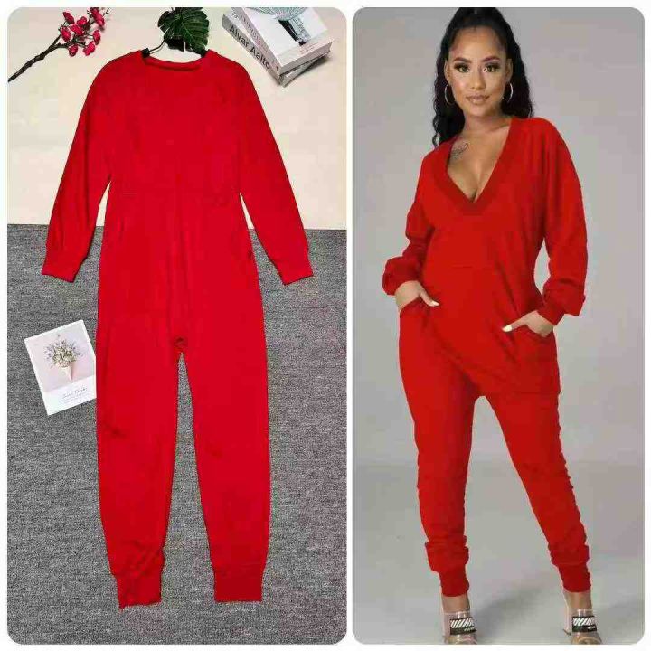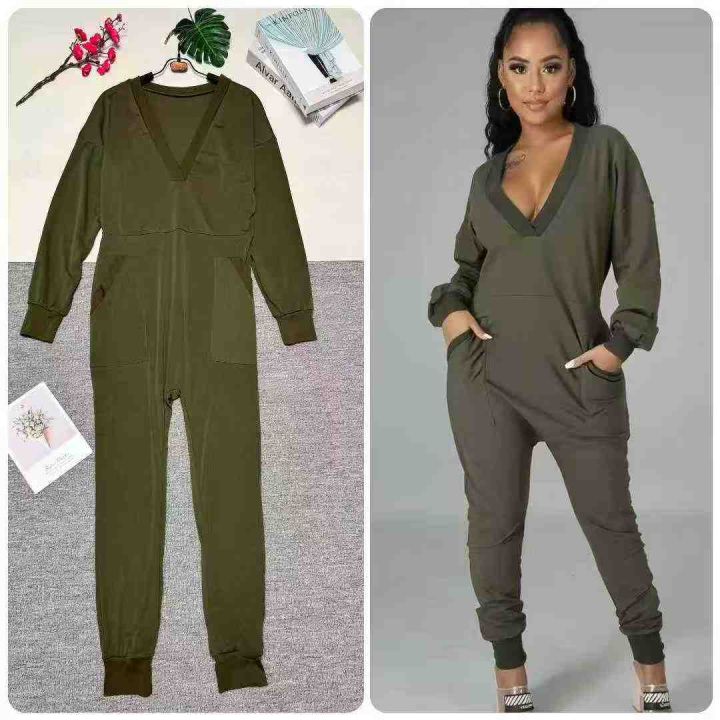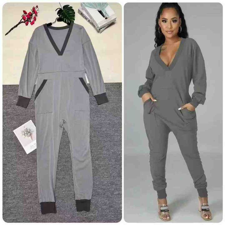 欧美跨境外贸V领口袋女装连体裤性感卫衣连衣裤,整款5色,数量285条,码数S-3XL,高弹力品质好,拉链式包装。
