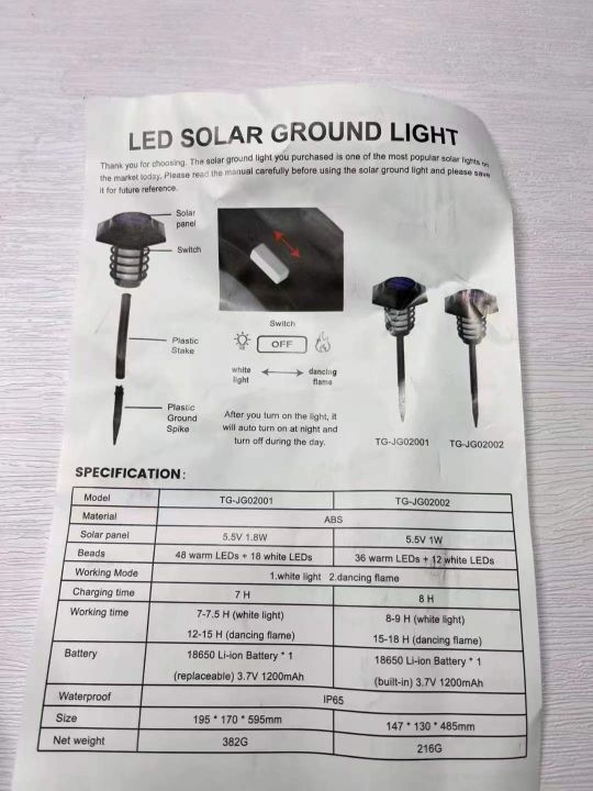 超大号太阳能草坪灯,两种光,白光+火焰灯,带18650电池1200mah,数量500个