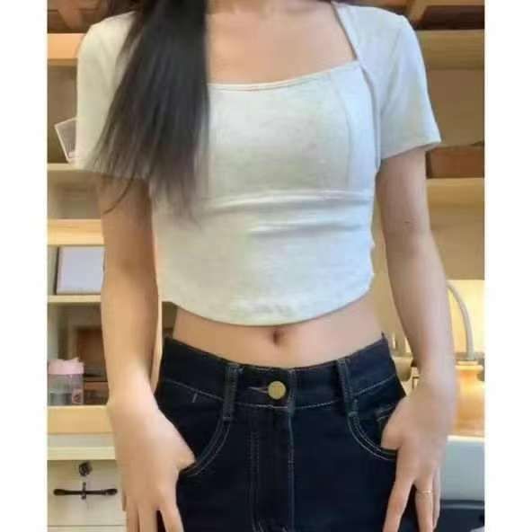 全清4.8元,数量800件,纯欲露背短袖T恤方领修身露锁骨显瘦,两个色黑色为主正肩甜辣辣妹短款上衣美式ins,独立包装,码数M-2XL,分货➕0.5
