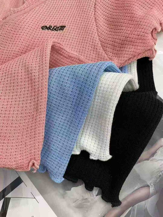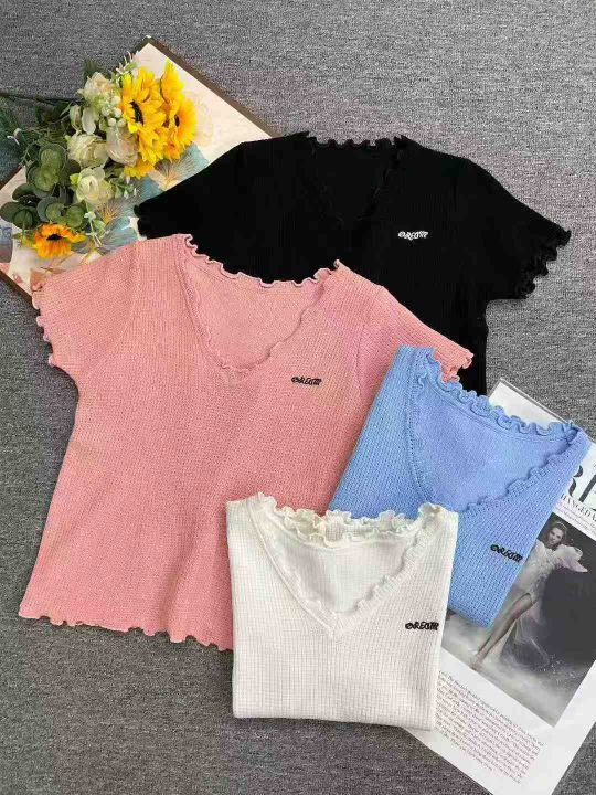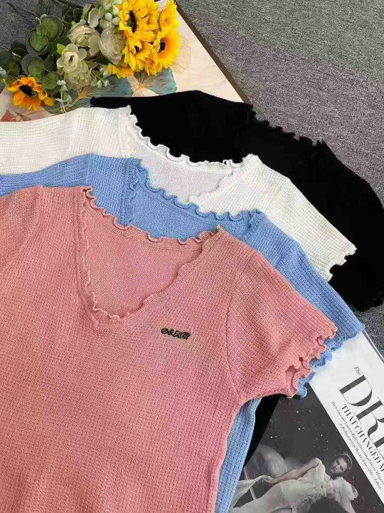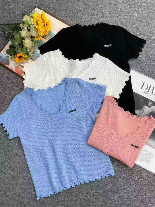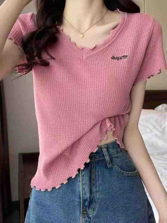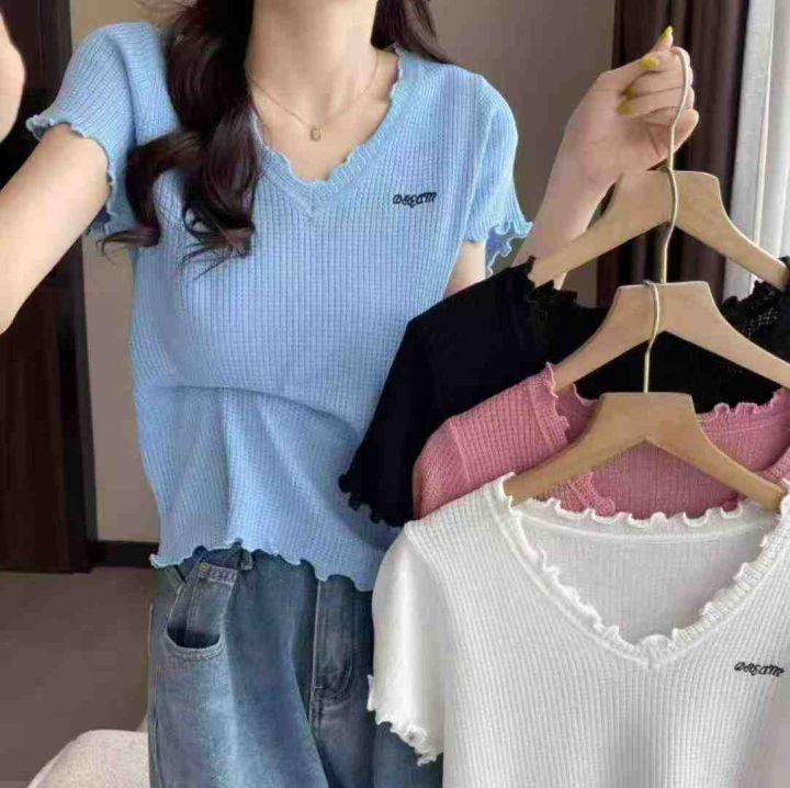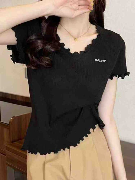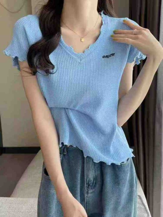 夏季新款大码冰丝洋气百搭显瘦v领木耳边针织短袖,独...
