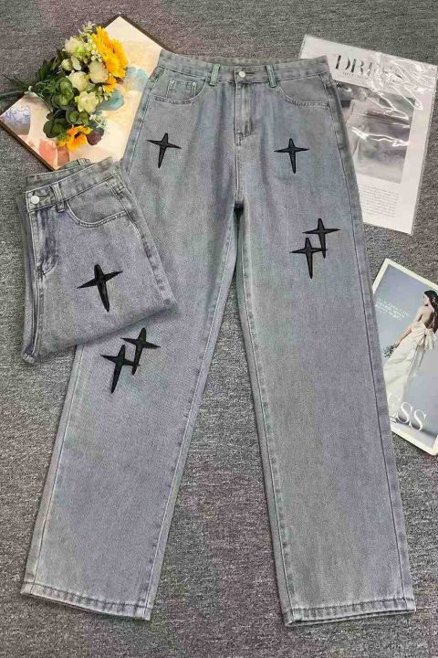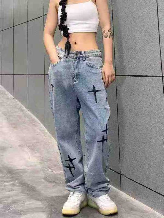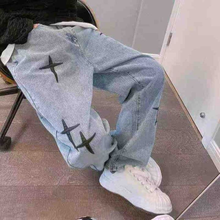 秋季新款男女同款韩版洗水棉网红设计款直筒牛仔阔腿裤...