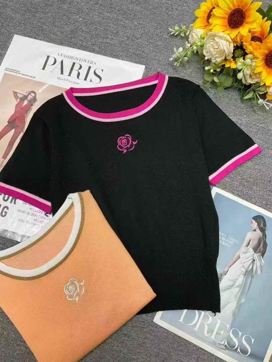 夏季新款撞色边玫瑰刺绣收腰显瘦针织短袖t桖,独立包装,均码面料柔软舒适...