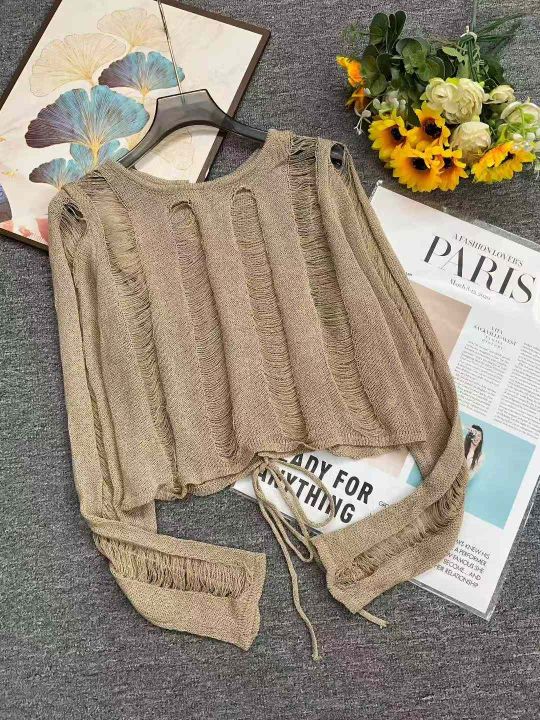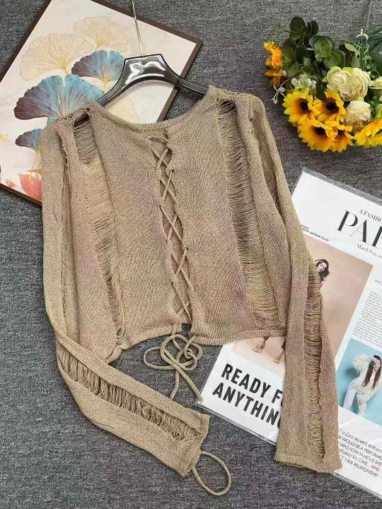 早秋新款纯欲风性感辣妹设计感绑带镂空两面穿针织长袖...