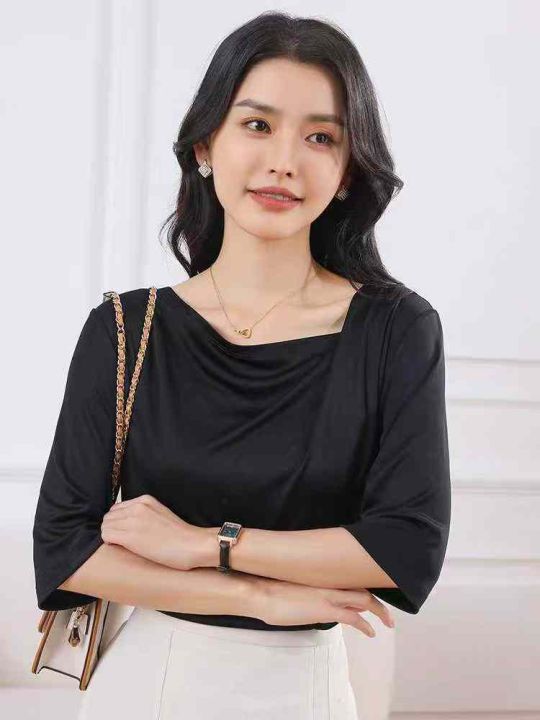 夏季新款轻奢法式三醋酸垂感丝滑缎面皱褶不规则斜肩T...