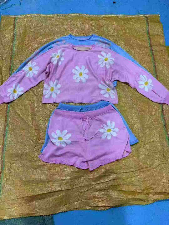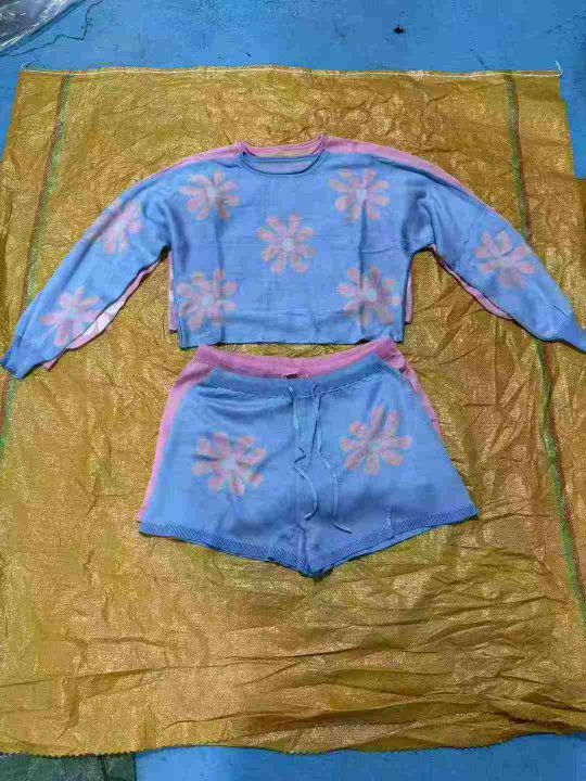 欧美秋冬女装时尚休闲彩色花朵针织长袖毛衣短裤两件套装,码数S-XL,蓝30 粉29,数量59套