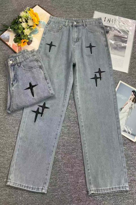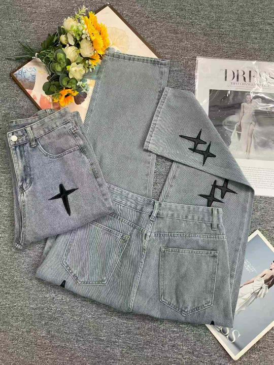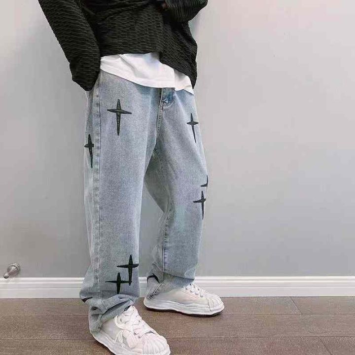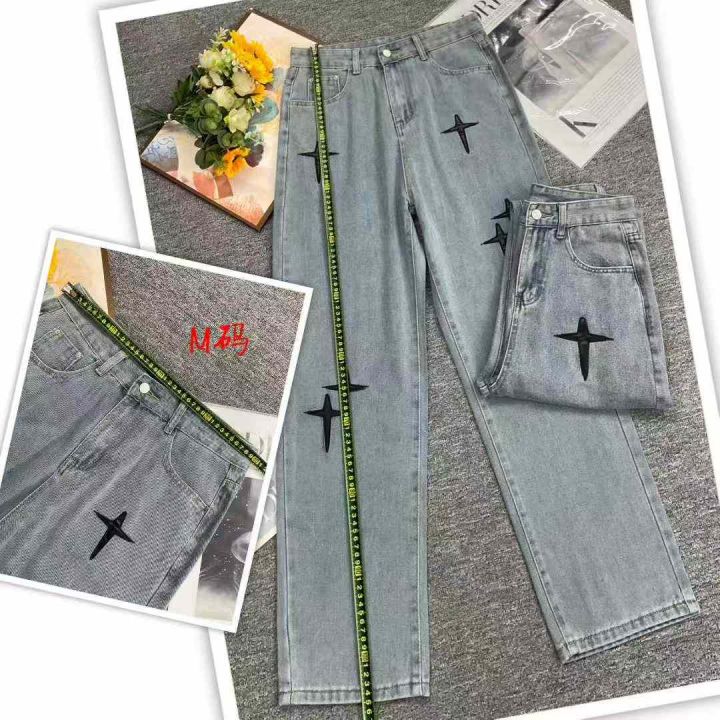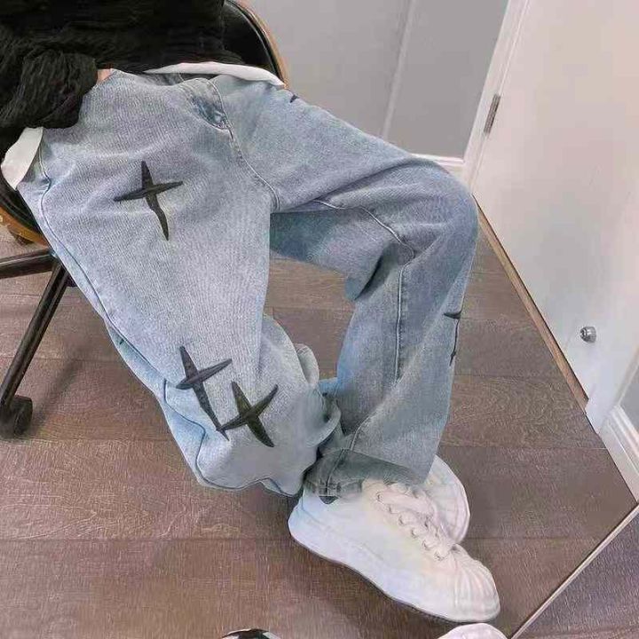 秋季新款男女同款韩版洗水棉网红设计款直筒牛仔阔腿裤...