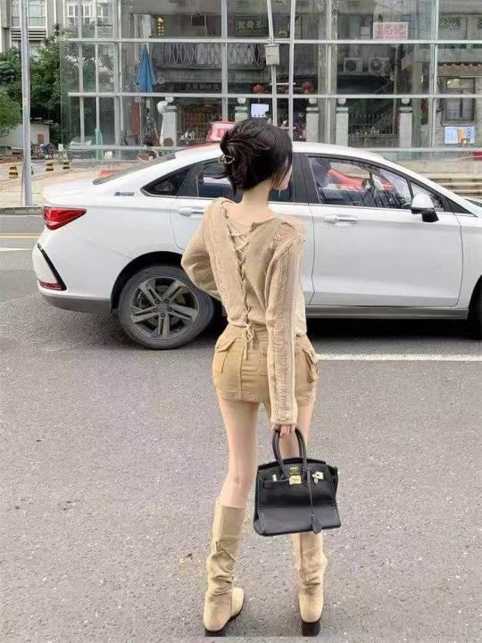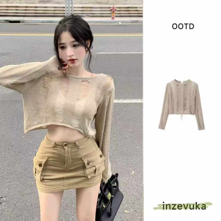 早秋新款纯欲风性感辣妹设计感绑带镂空两面穿针织长袖...