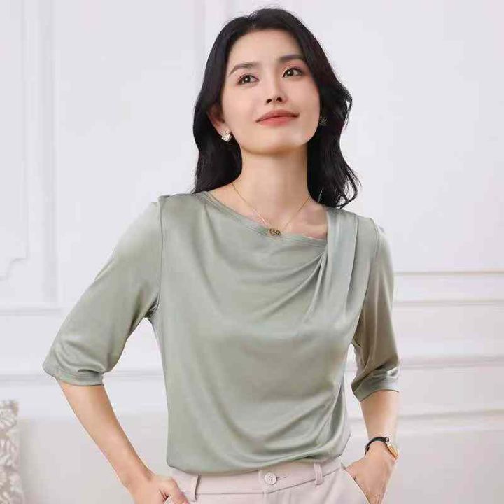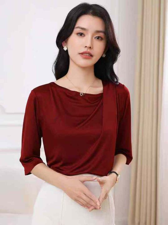 夏季新款轻奢法式三醋酸垂感丝滑缎面皱褶不规则斜肩T...