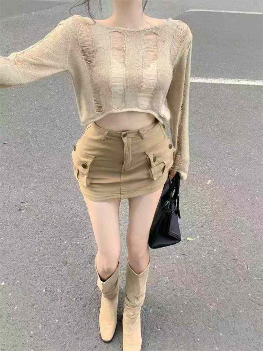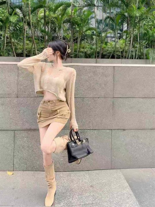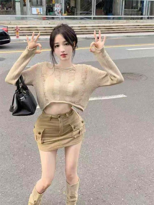 早秋新款纯欲风性感辣妹设计感绑带镂空两面穿针织长袖...