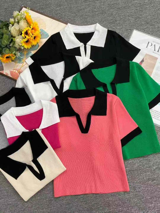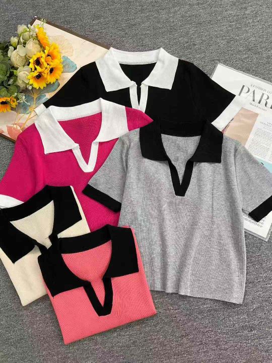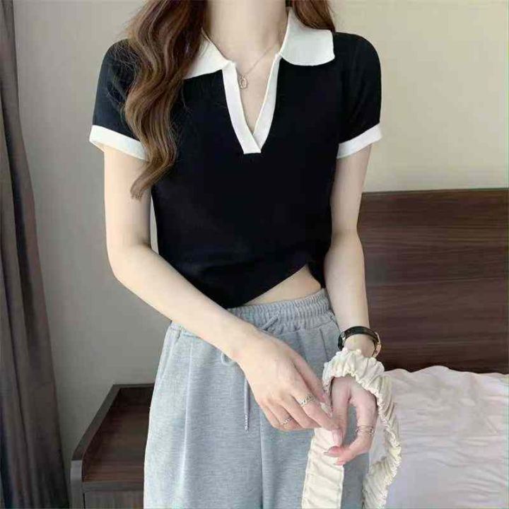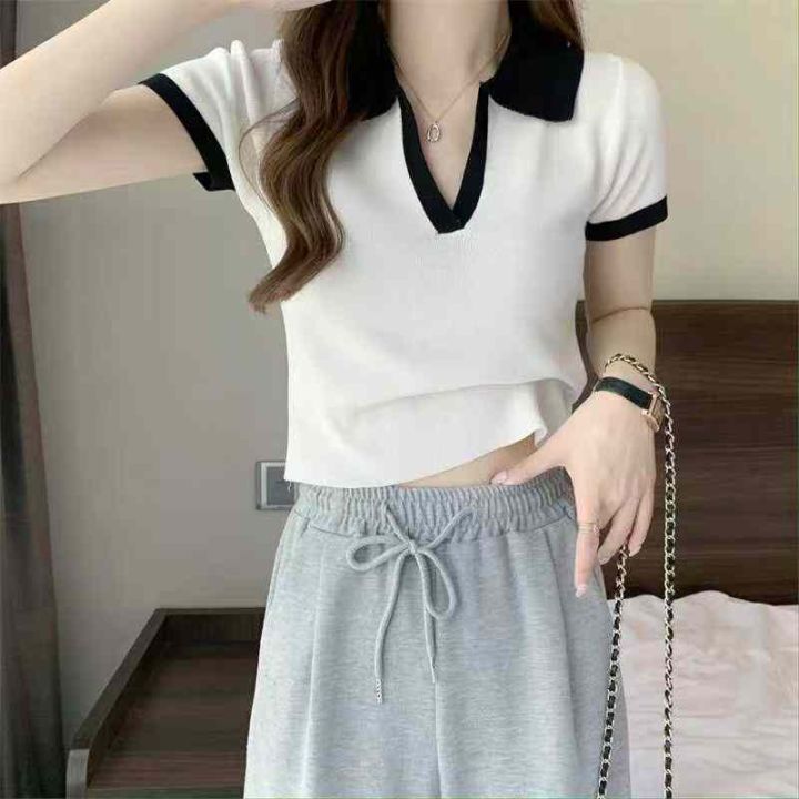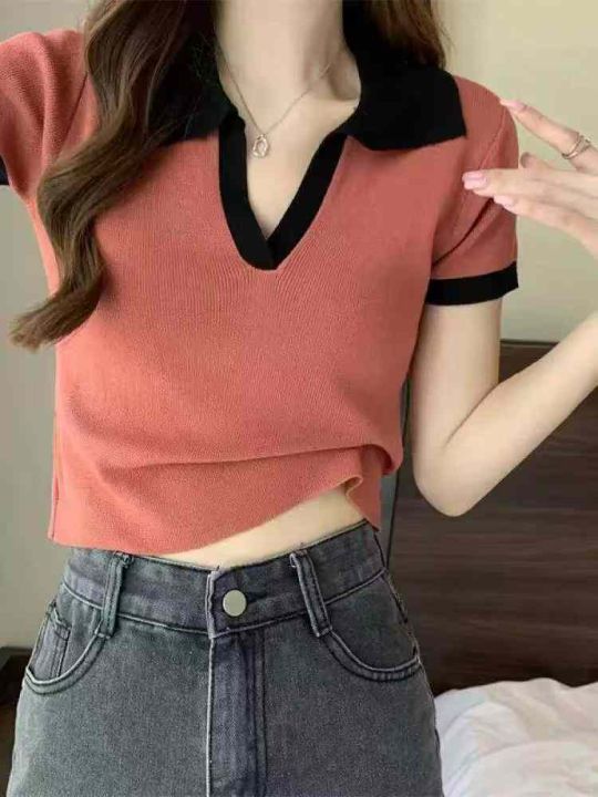 夏季新款弹力修身显瘦洋气polo领正肩冰丝短袖针织小衫...