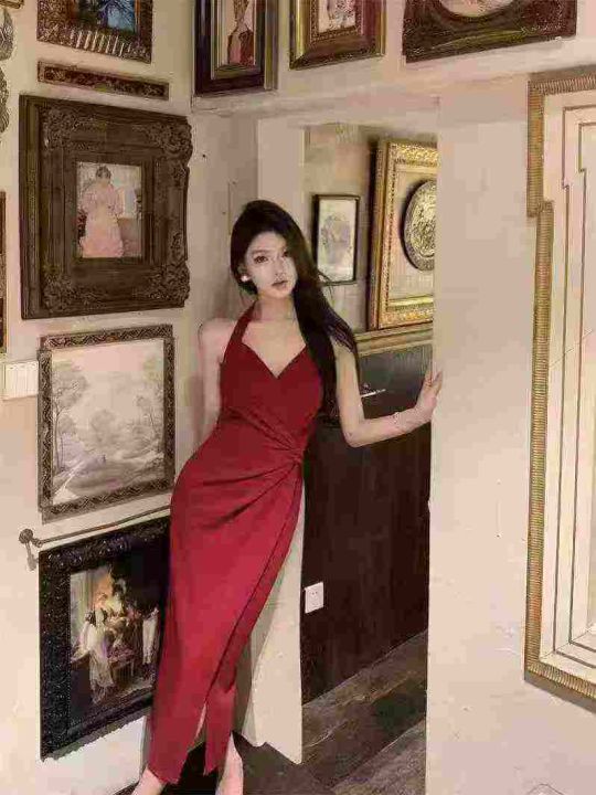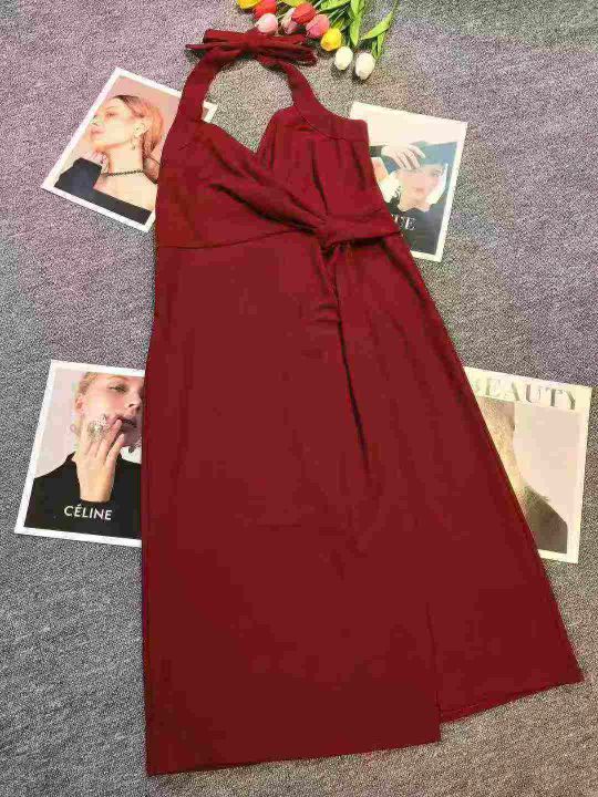 品牌大码胖mm辣妹纯欲风挂脖V领开叉长款连衣裙,[爱心]65件左右,L-3XL,穿100-150斤,万佳新货,原包装️无瑕疵