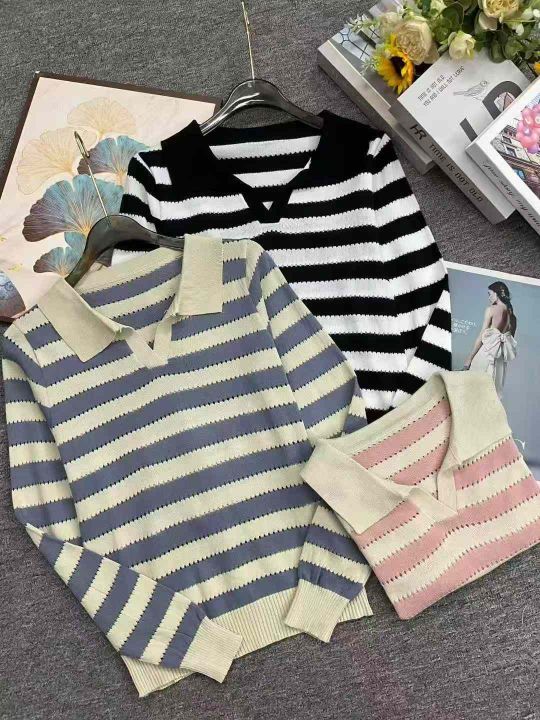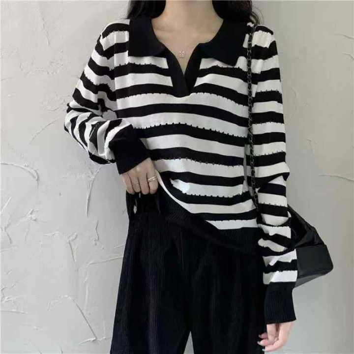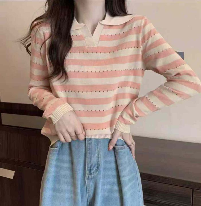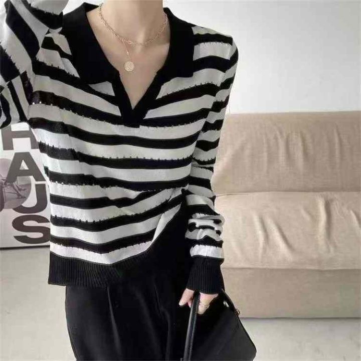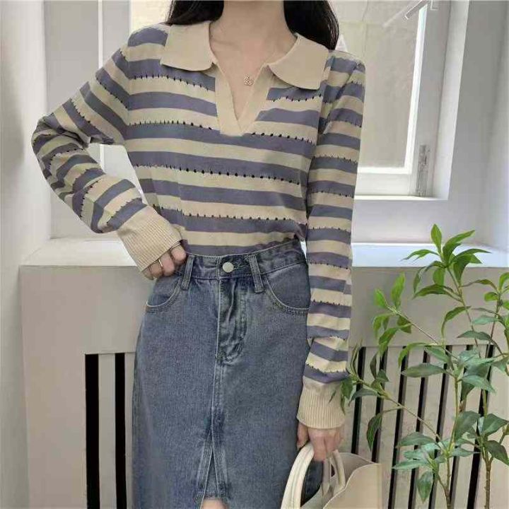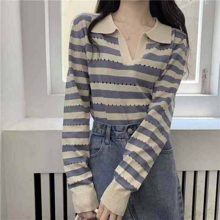 初秋新款复古设计感镂空条纹polo领针织套头毛衣,独立...