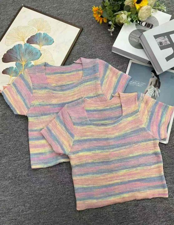 夏季新款甜辣方领彩虹条纹冰丝针织短袖T恤,独立包装...