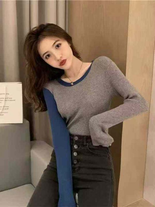 秋冬新款高弹力修身显瘦撞色设计感包芯纱打底长袖针织衫,独立包装,均码面...