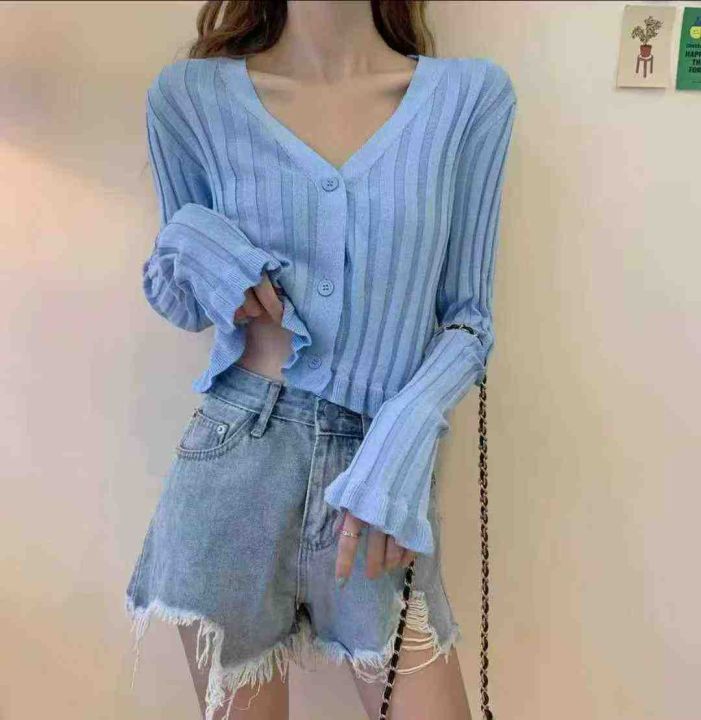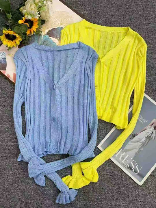 早秋新款薄款纯色洋气荷叶边v领长袖短款针织开衫,独...