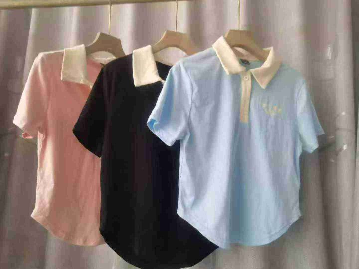美式polo领短袖T恤女夏季新款设计复古辣妹修身显瘦短款上衣ins潮,s一3XL码,主要是黑色多,纯棉质量好,防水袋装,1580件。全清4.8块,分货加一
