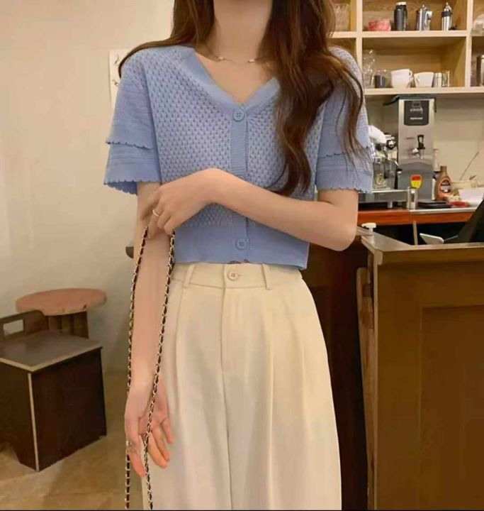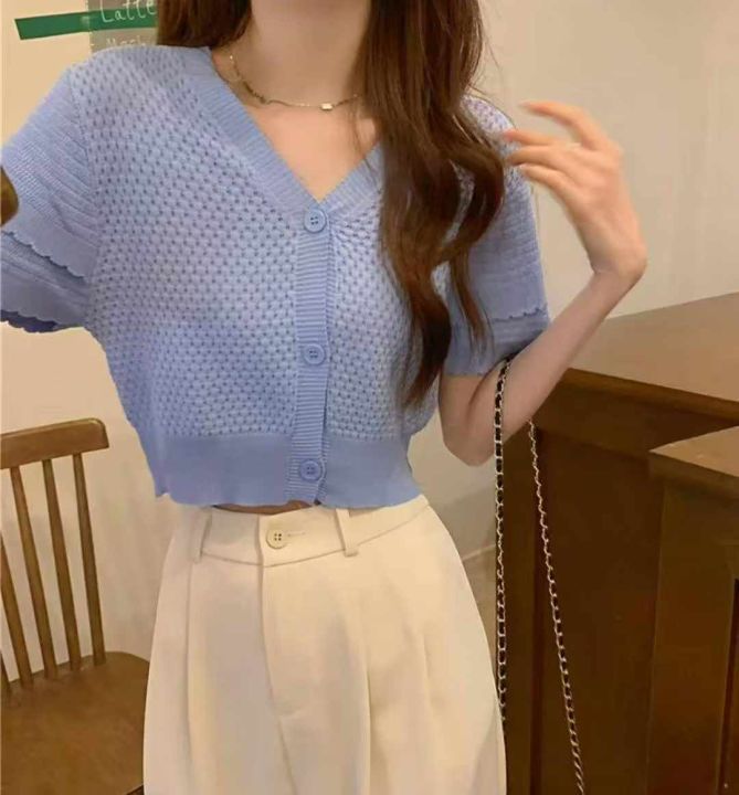 夏季新款法式小香风短款宽松洋气显瘦镂空短袖冰丝针织...