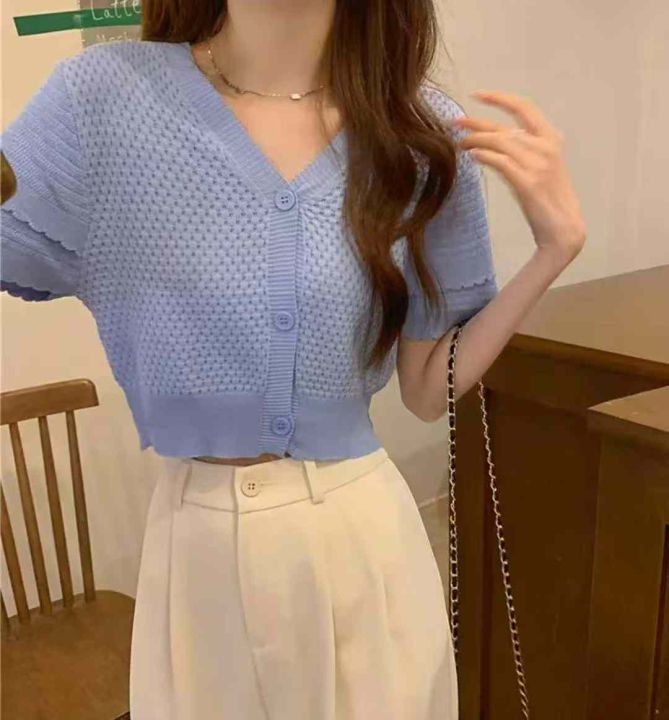 夏季新款法式小香风短款宽松洋气显瘦镂空短袖冰丝针织...