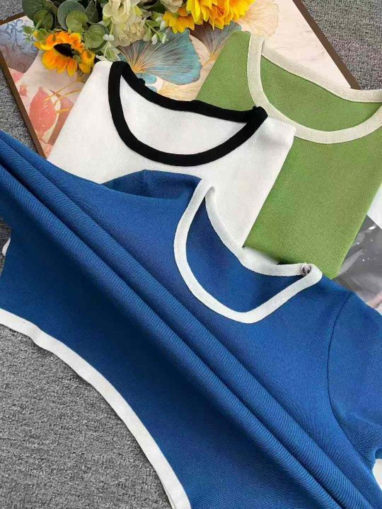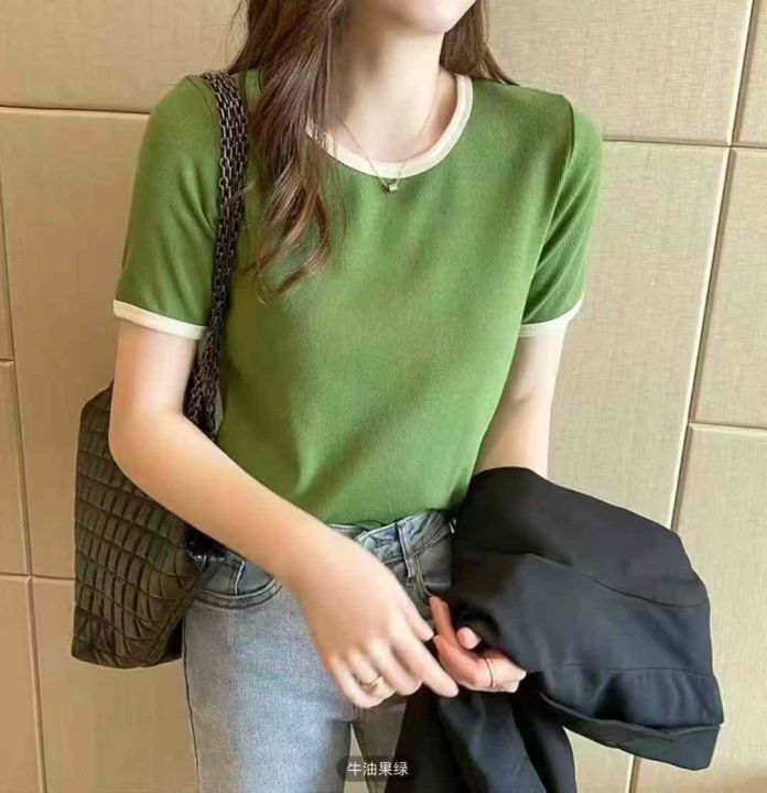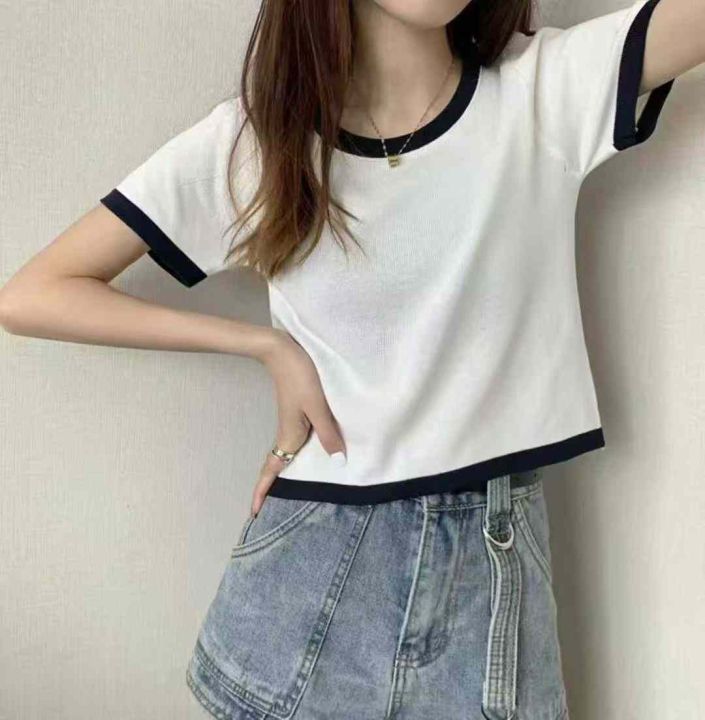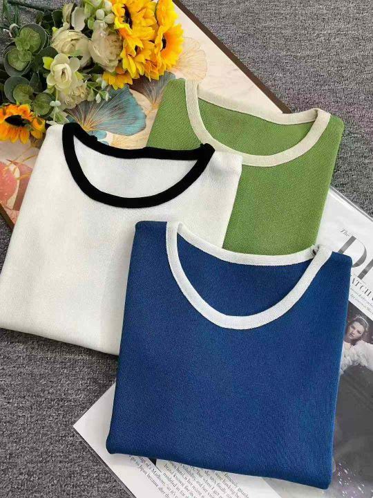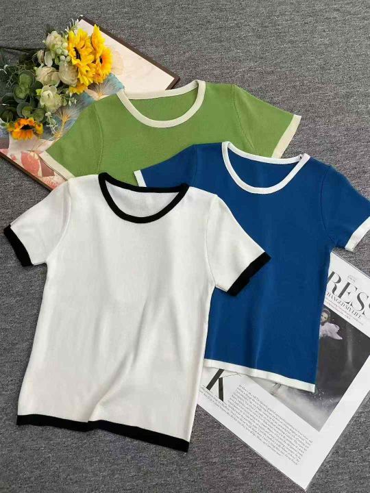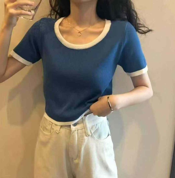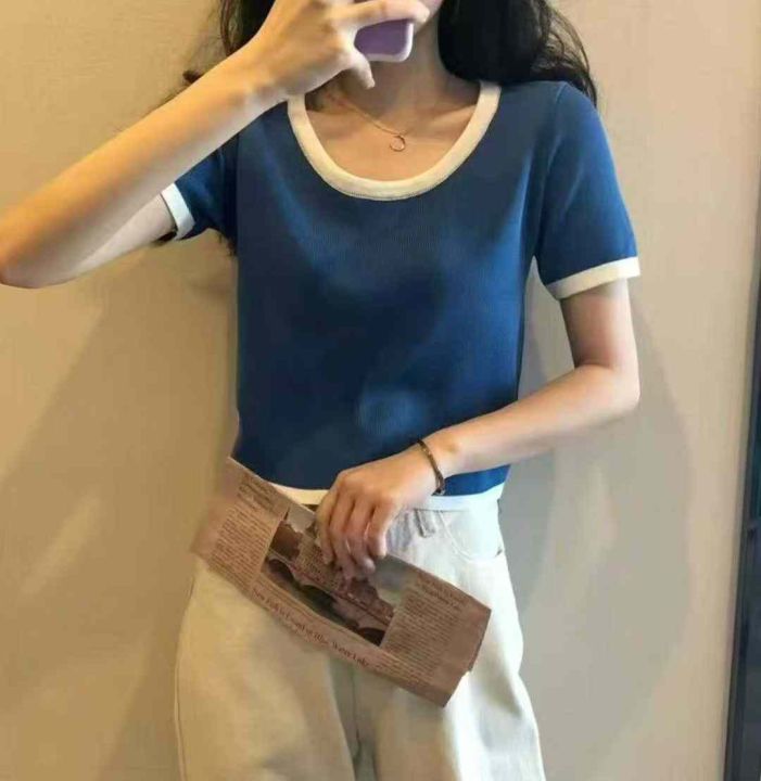 夏季新款韩系网红显瘦别致撞色针织短袖T桖,独立包装...