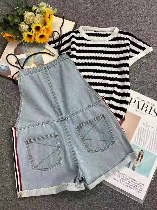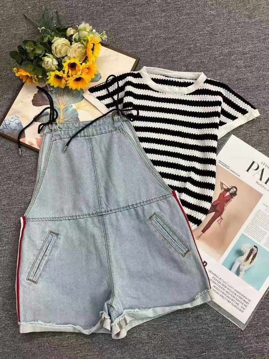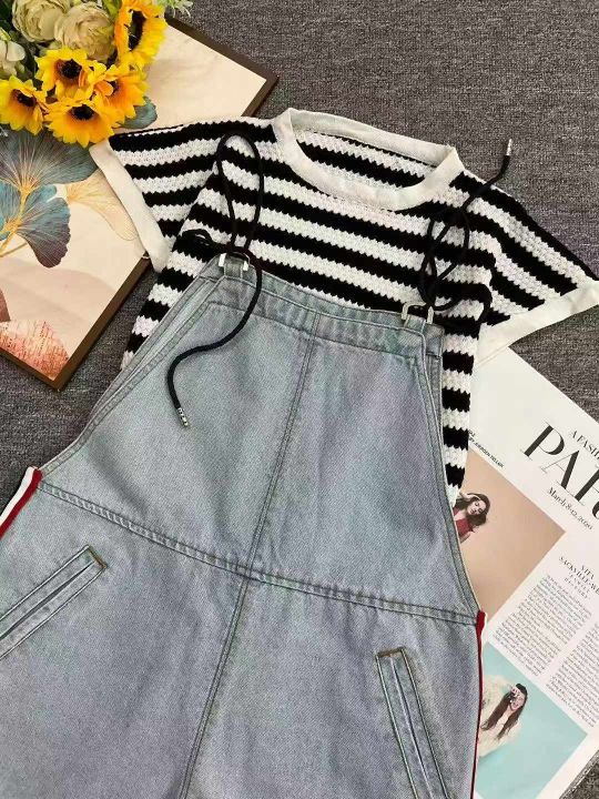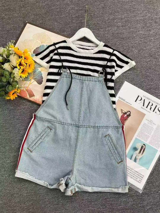 夏季新款撞色条纹针织T桖+洗水棉牛仔背带短裤2件套,...