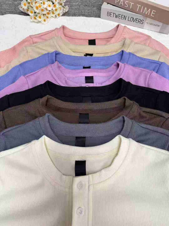 夏别致小圆领纽扣修身短袖t恤,整款多色,高弹力,领口有包边,面料厚实有质感,品质好可入实体店,数量450件左右,码数xs-xl,全清6.9,分货+1
