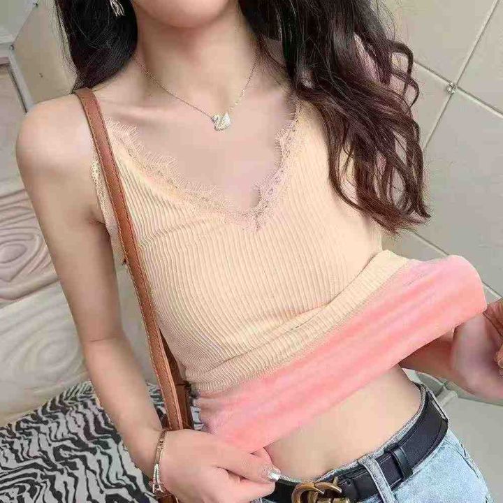 秋冬新款加绒加厚保暖弹力修身打底内搭v领蕾丝无袖针...