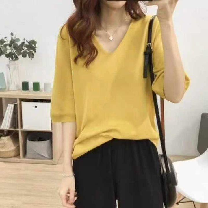 春夏季新款女装简约净版宽松气质V领包芯纱针织套头毛...