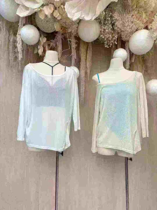 十三行高品质大吊卡防晒薄款上衣❤️上身巨好看~纯欲辣妹的既视感里面穿吊带超级好看,面料舒服不扎人,薄薄的微透超级美一字肩或者露肩穿都可以,均码✅蓝色少,杏色多,数量413件Ladies sexy sunscreen clothing, average size, quantity 413 pieces, clearing 3.9 RMB.