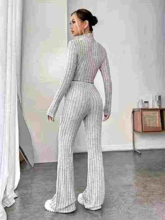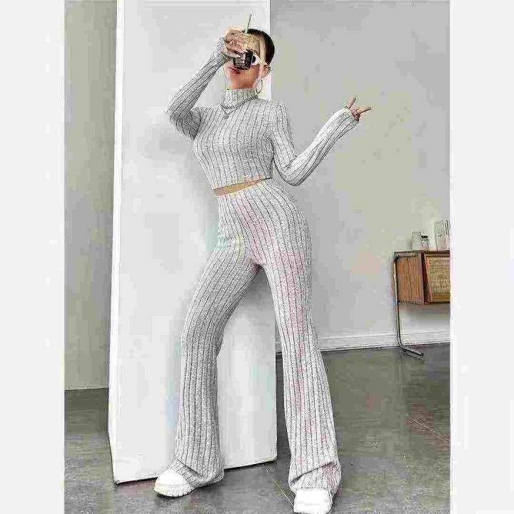 纯色坑条长袖针织衫套装,独立包装,码数S-XL,数量48套Women\'s two-piece suit, size S-XL, quantity 48 pieces.