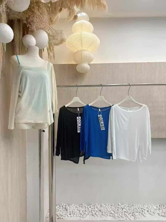十三行高品质大吊卡防晒薄款上衣❤️上身巨好看~纯欲辣妹的既视感里面穿吊带超级好看,面料舒服不扎人,薄薄的微透超级美一字肩或者露肩穿都可以,均码✅蓝色少,杏色多,数量413件