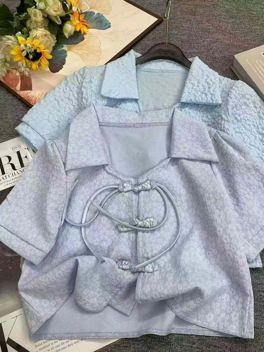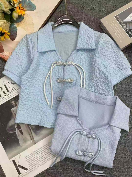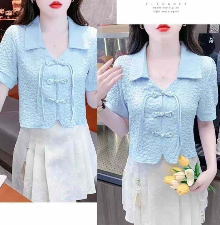 夏季新款新中式国风盘扣法式polo领改良短款雪纺小衫,...