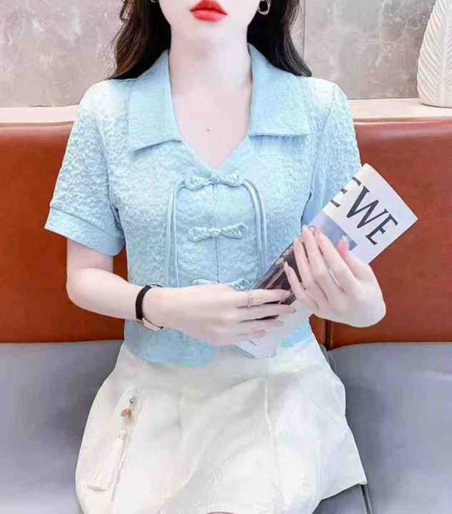 夏季新款新中式国风盘扣法式polo领改良短款雪纺小衫,...