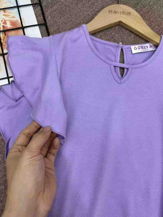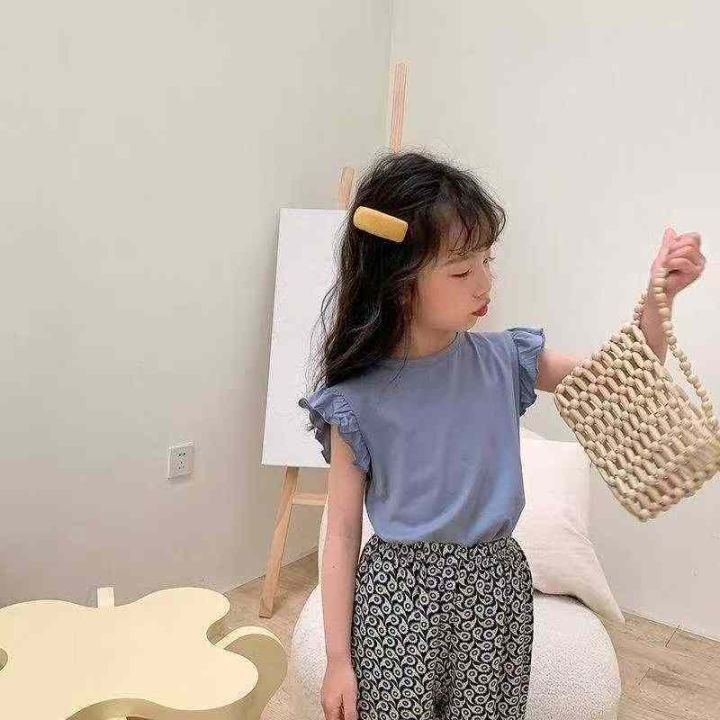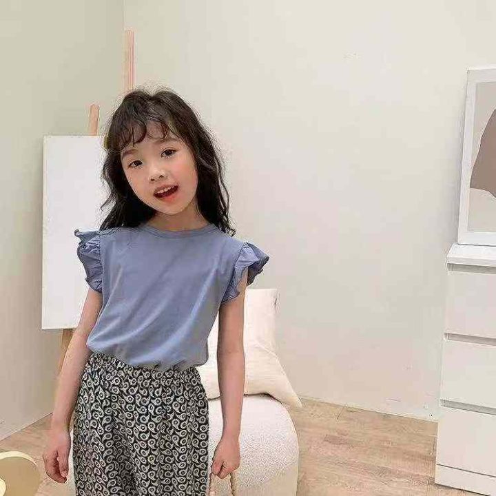 韩版夏季儿童装短袖T恤2025女童上衣宝宝无袖甜美纯棉飞飞袖洋气,102件,码数6-14y,单款单色,模特图只供参考。