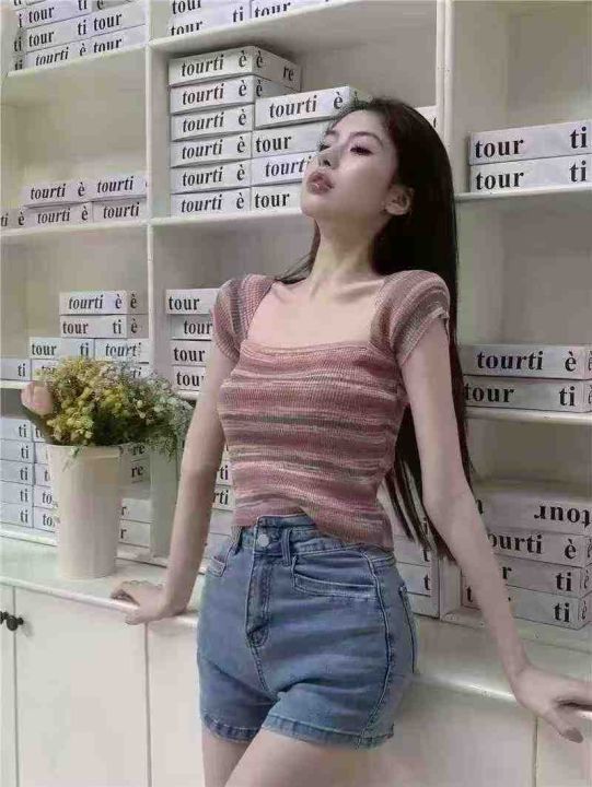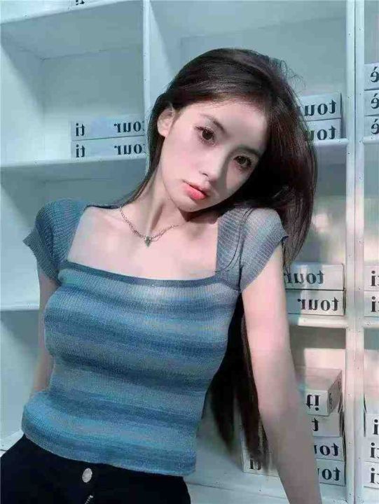 夏季新款方领撞色条纹简约复古文艺时尚减龄针织T桖,独立包装,均码面料软糯舒适弹力大,420件,全清5.9元超低价秒杀!分货加一!