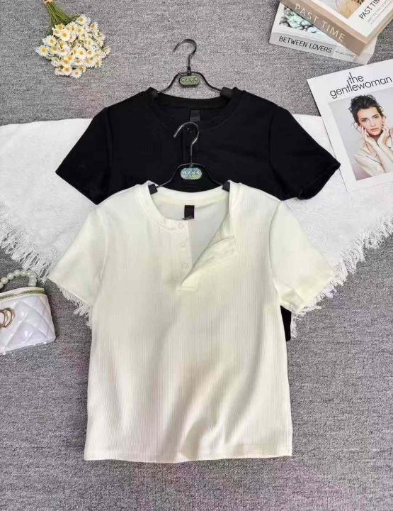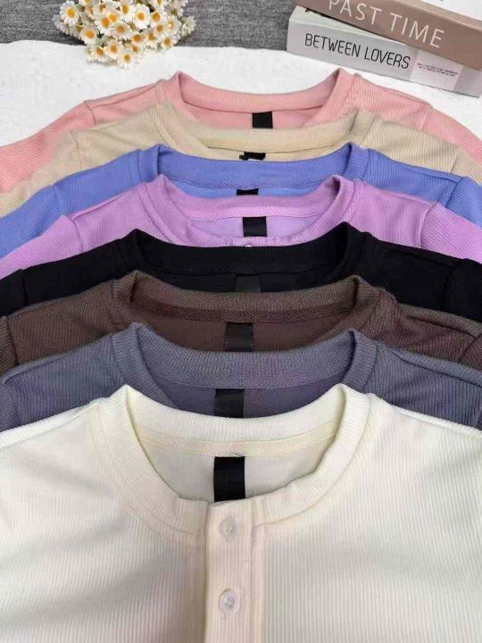 夏别致小圆领纽扣修身短袖t恤,整款多色,高弹力,领口有包边,面料厚实有质感,数量450件左右,码数xs-xl,全清5.9,分货+1