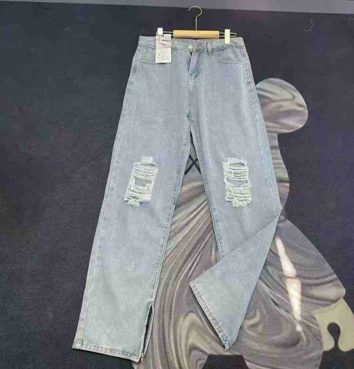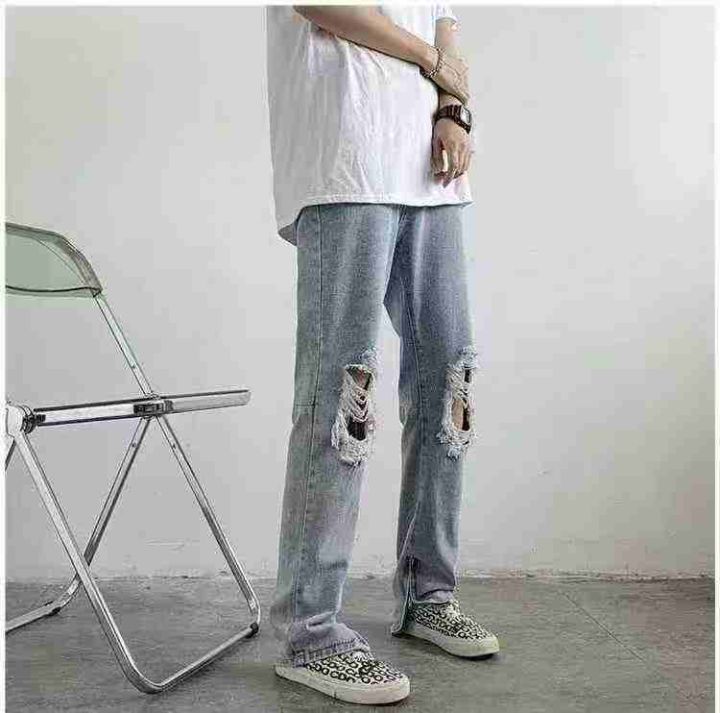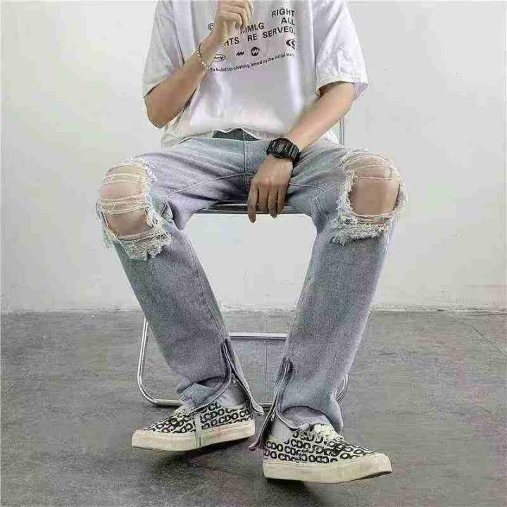 天猫在售130件高品质潮牌设计款膝盖破洞男装牛仔拉链直筒裤,单款单色,XL-3XL,全新扣眼未开独立包装带吊牌
