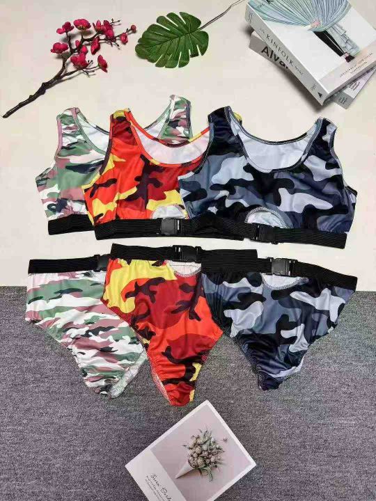 欧美性感潮流迷彩装订边背心套装,整款三色,数量167套,码数S-2XL,高弹力,卡扣设计,品质好拉链式包装。