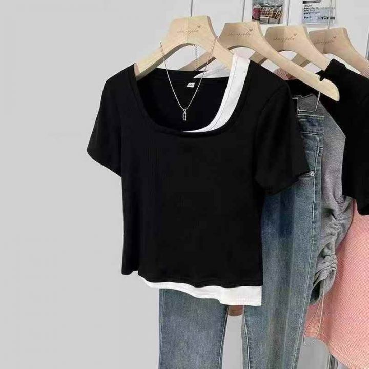 [發]女装假两件正肩辣妹短袖220件独立包装 码数S M 设计感小众上衣ins潮...