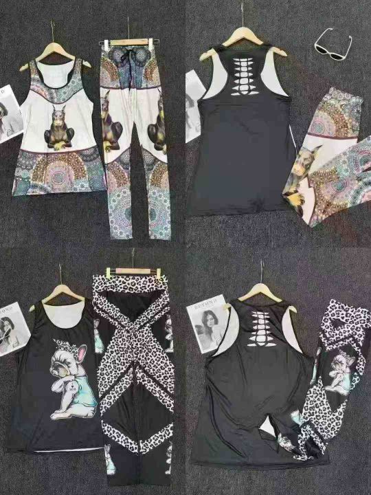 数量:1000套左右,全清价6.8,夏季印花女款瑜伽套装,休闲性感跑步健身背心高腰运动紧身裤大码两件套,码数:S~5XL,独立包装