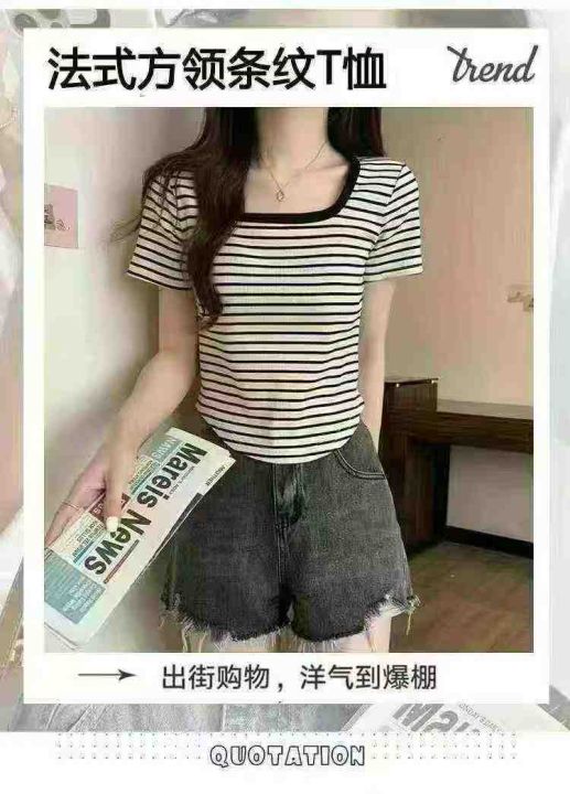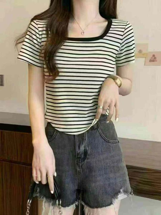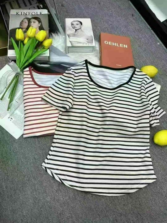 韩都衣舍条纹短袖t恤女2025夏季新款弧形设计感辣妹百搭上衣,792件,(型号508#3)1-3码,分货加1