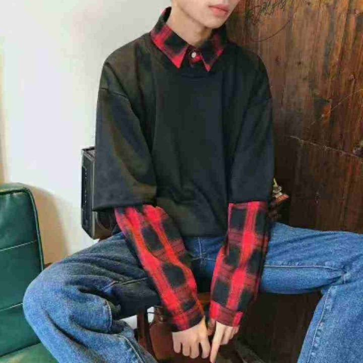 爆款假两件卫衣春秋新款美式复古格子上衣宽松休闲,数...