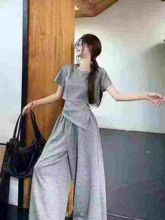 时尚阔腿休闲套装新款设计感洋气减龄显瘦短袖阔腿裤两件套,整款2色,灰色...