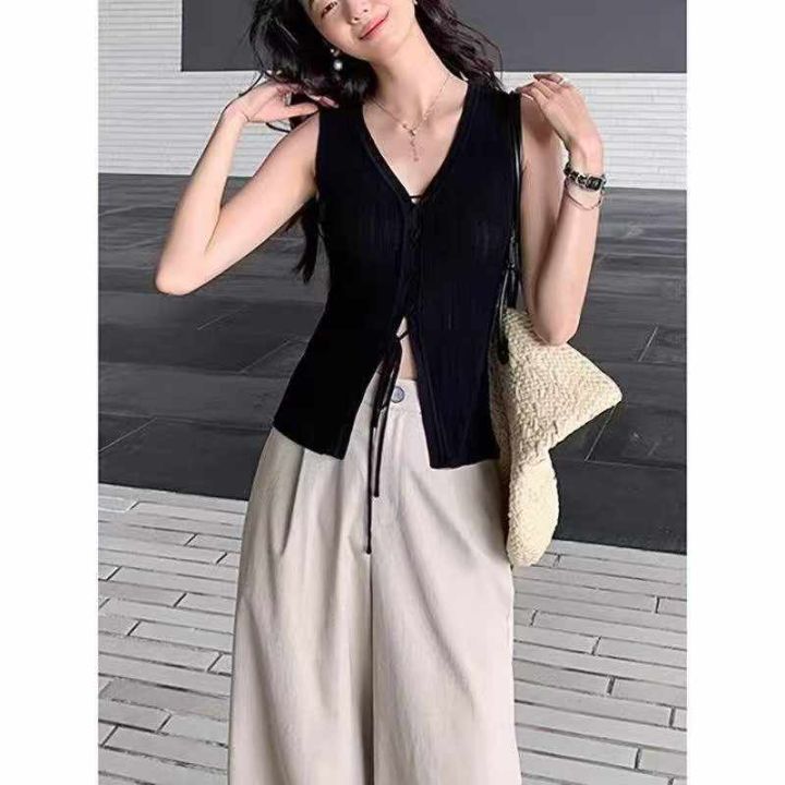 夏季新款设计感独特别致绑带薄款v领冰丝无袖针织衫,...