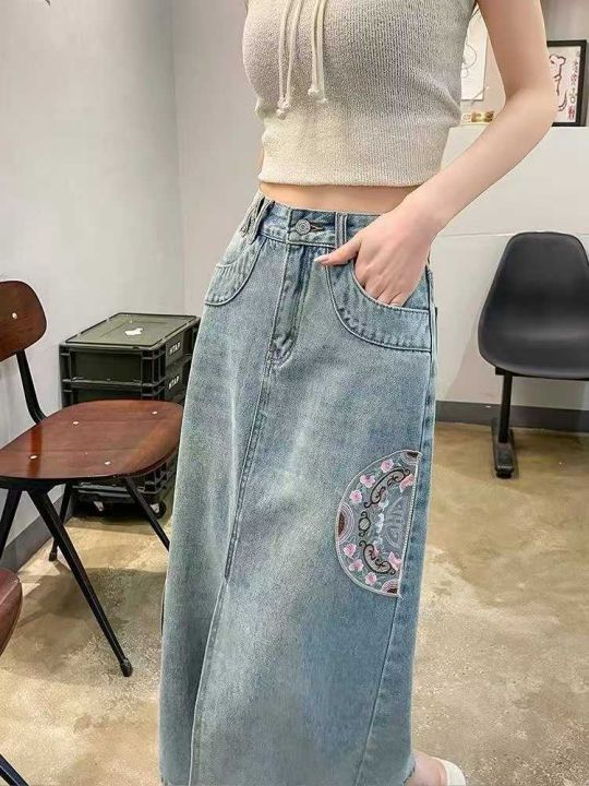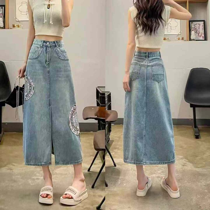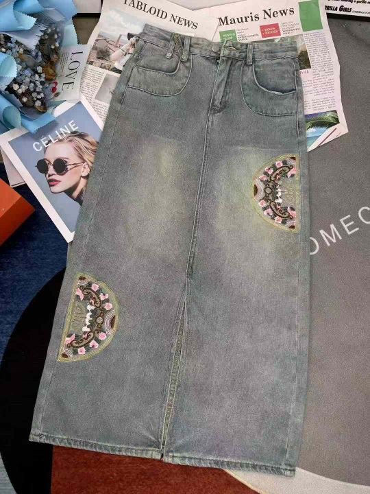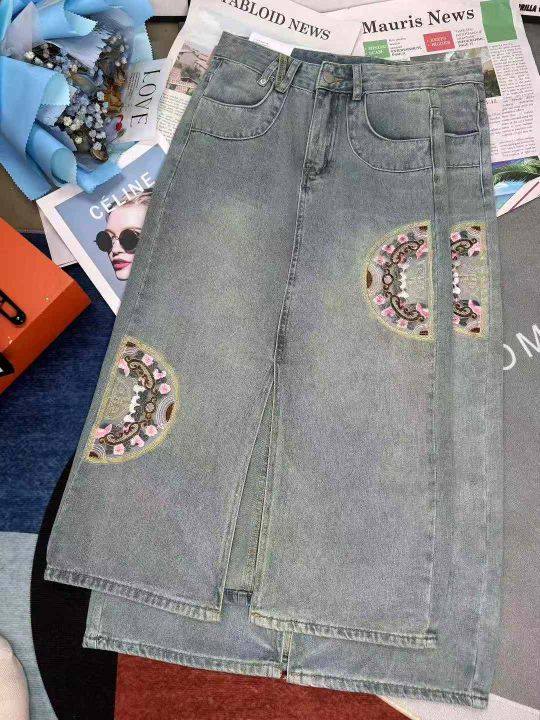中国风刺绣开叉长牛仔裙,单款单色2个长度,独立包装...