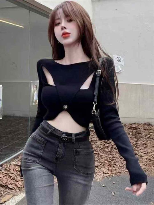 早秋季新款性感纯欲风辣妹高腰露脐弹力修身长袖针织衫...