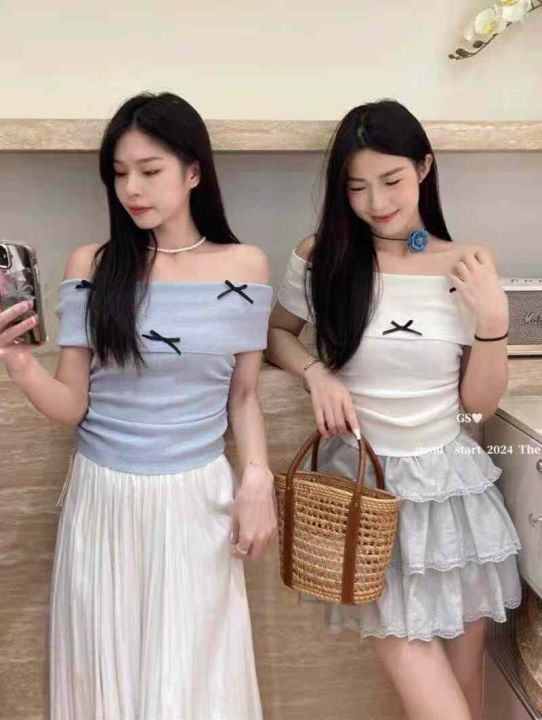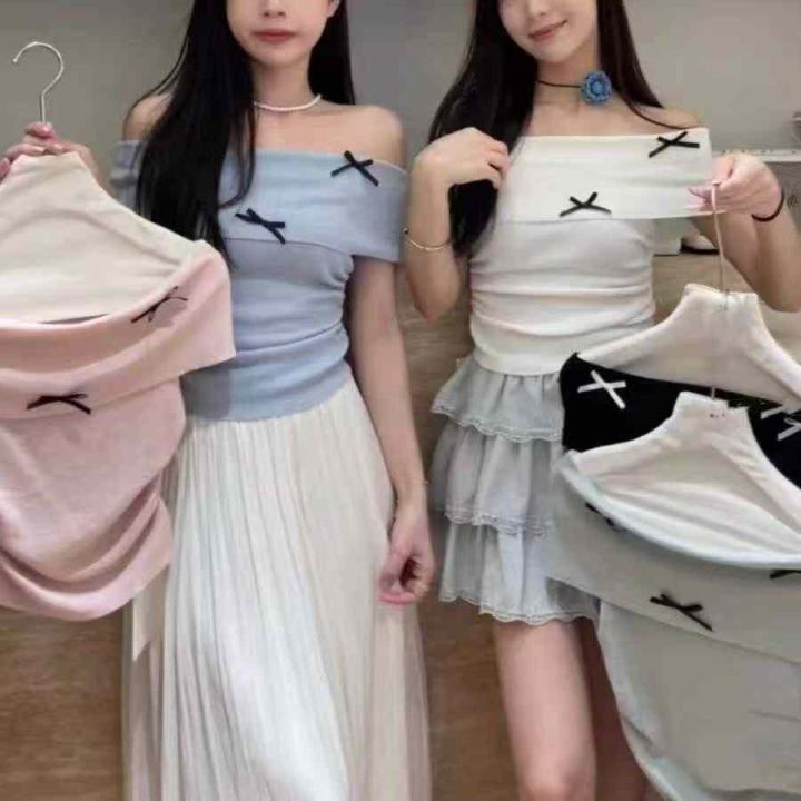 夏季新款纯欲性感一字领蝴蝶结弹力修身显瘦针织小衫,...