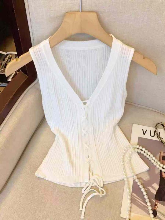 夏季新款设计感独特别致绑带薄款v领冰丝无袖针织衫,...