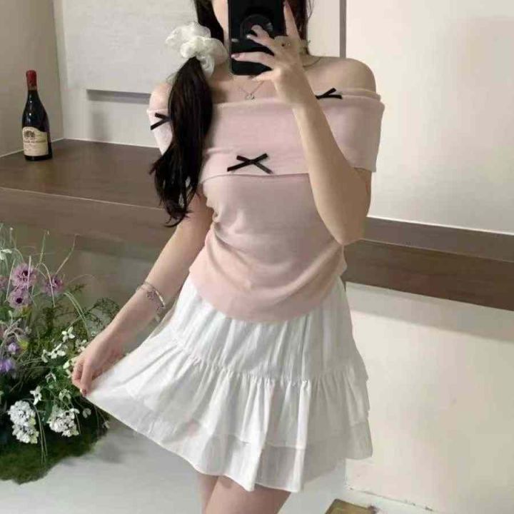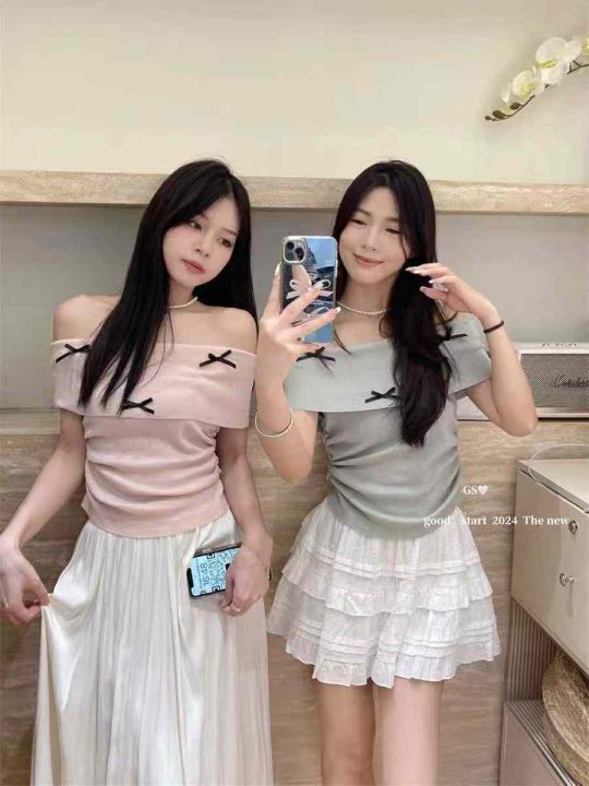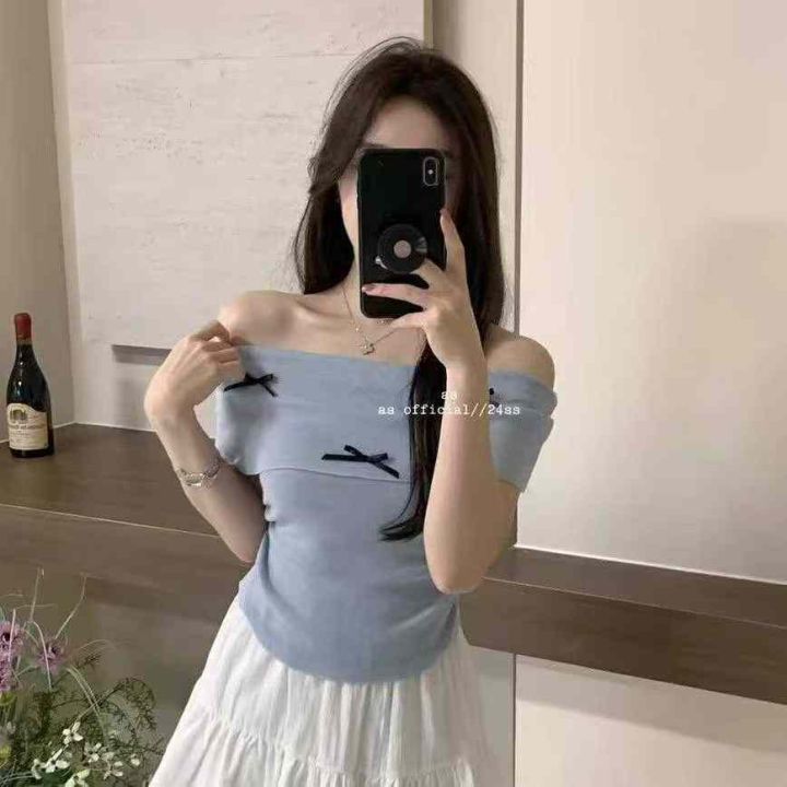 夏季新款纯欲性感一字领蝴蝶结弹力修身显瘦针织小衫,...
