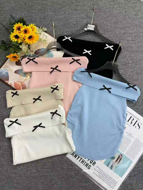 夏季新款纯欲性感一字领蝴蝶结弹力修身显瘦针织小衫,独立包装,均码面料软糯舒适弹力大,350件,全清6.9元超低价秒杀!分货加一!