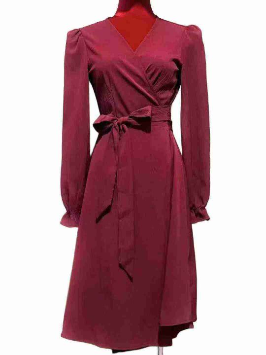 纯色裹胸款春秋季衩领束带灯笼袖长袖连衣裙